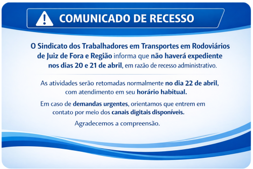 O Sindicato dos Trabalhadores em Transportes em Rodoviários de Juiz de Fora e Região informa que não haverá expediente nos dias 20 e 21 de abril, em razão de recesso administrativo.